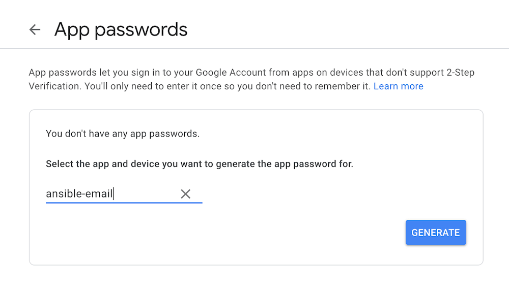 Select App Passwords and you will reach another window. (Google may ask you to enter your password to verify). Create a new App Password by selecting Others from the dropdown selection.
