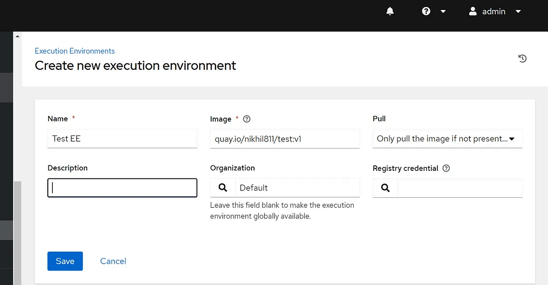 Enter the necessary details about your execution environment image, such as the name, image registry location, tag, and pull policy.
