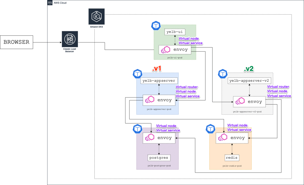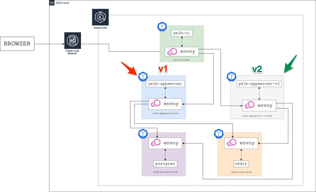 - The architecture diagram below shows the environment with two versions of the yelb- appserver running at the same time (v1 and v2):