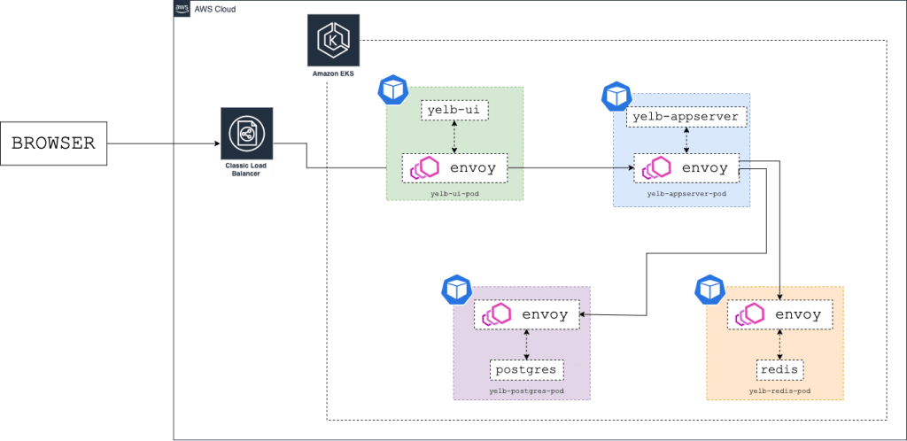 - Deploy the Yelb application in the yelb namespace and use the same name for the mesh . You need to add two labels to the yelb namespace: mesh and appmesh.k8s.aws/sidecarInjectorWebhook . The labels instruct the controller to inject and configure the Envoy proxies in the pods: