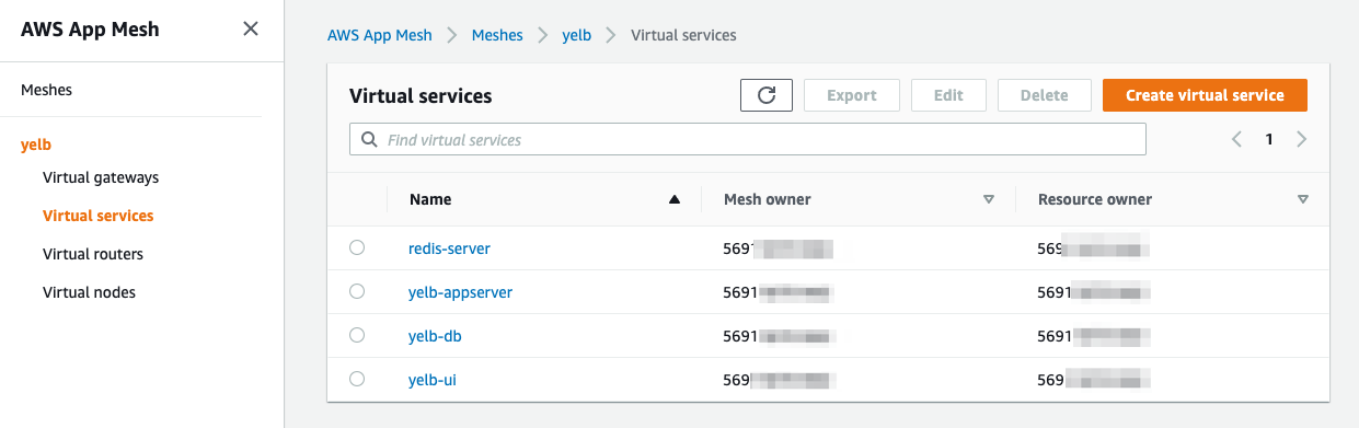 - After creating the Service Mesh , you have to create all the App Mesh components for every Yelb component.