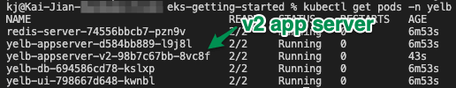 - You should be able to see a new version of the yelb-appserver running by listing the pods in the yelb namespace: