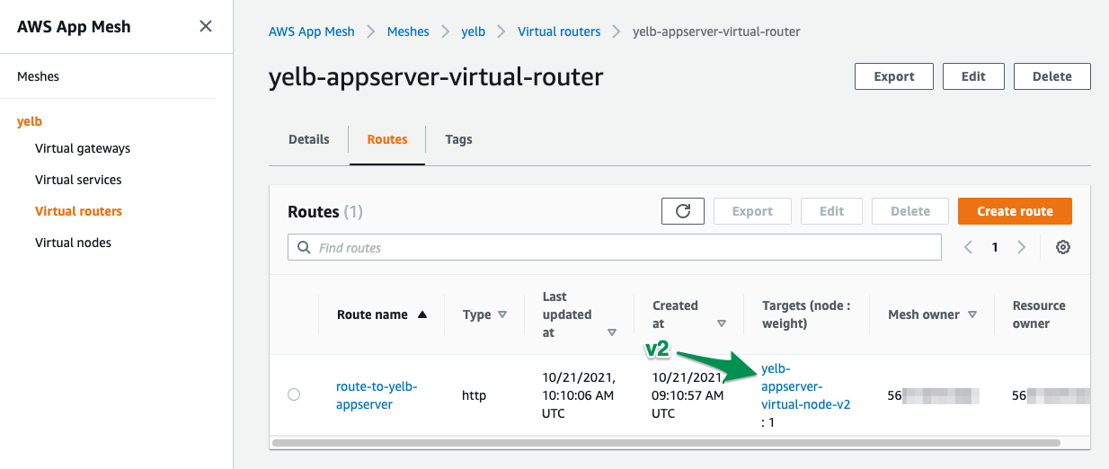 - Lastly, let’s change the Virtual Route to route all (100%) traffic to the newest version ( v2 ) of yelb-appserver :