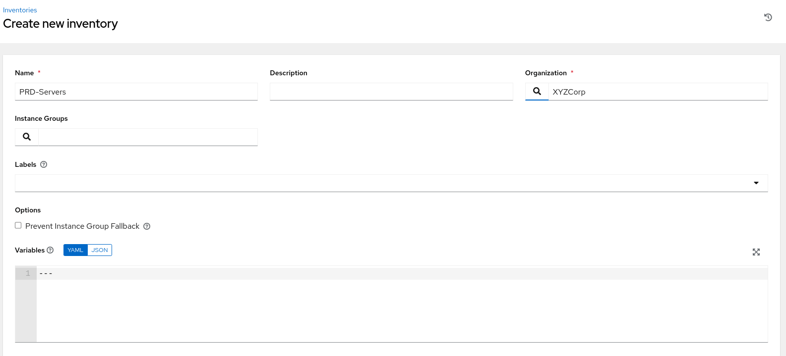 Navigate to the Inventories section and create a new inventory or use an existing one. Adjust configurations as needed, but primarily focus on the inventory name.