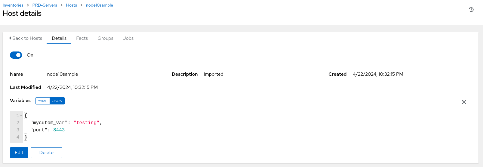 We have node10sample mycutom_var=testing port=8443 in our inventory file ( demohosts.ini ) and see the same synced on the automation controller.