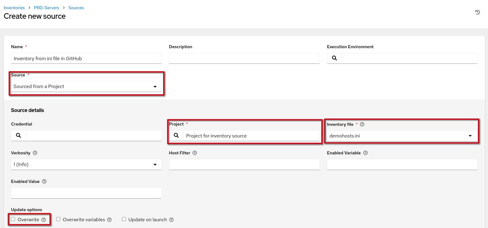 demohosts.ini). Update options: Overwrite: Checked: Removes hosts/groups no longer present in the inventory file. Unchecked: Local changes remain untouched.
