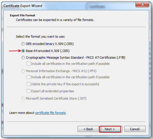 Select Base-64 encoded X.509 (.CER) in the File format window , then Next.