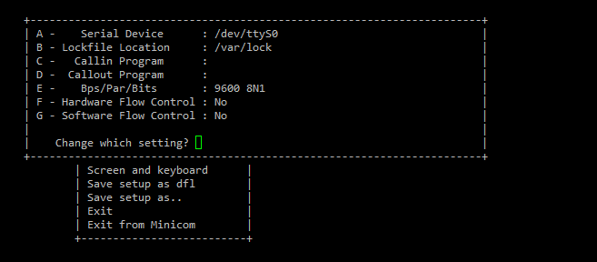 To exit Minicom when in terminal mode press ‘Ctrl-A’ to get a message bar at the bottom of the terminal window and then press ‘X’.