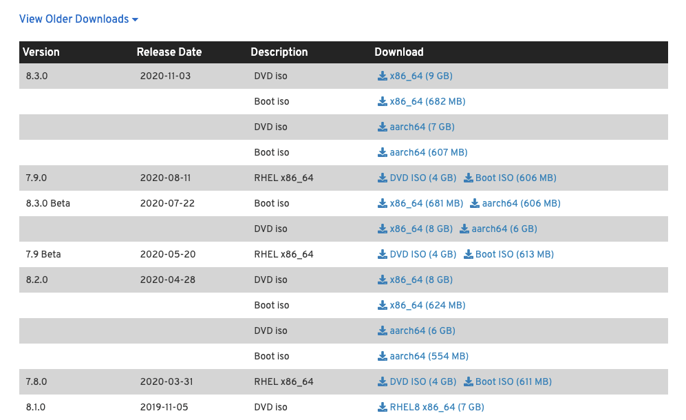 By default the screen will show the latest available RHEL versions only. If you want to download an older version of RHEL (eg: RHEL8.2), then find the View Older Downloads link as below.