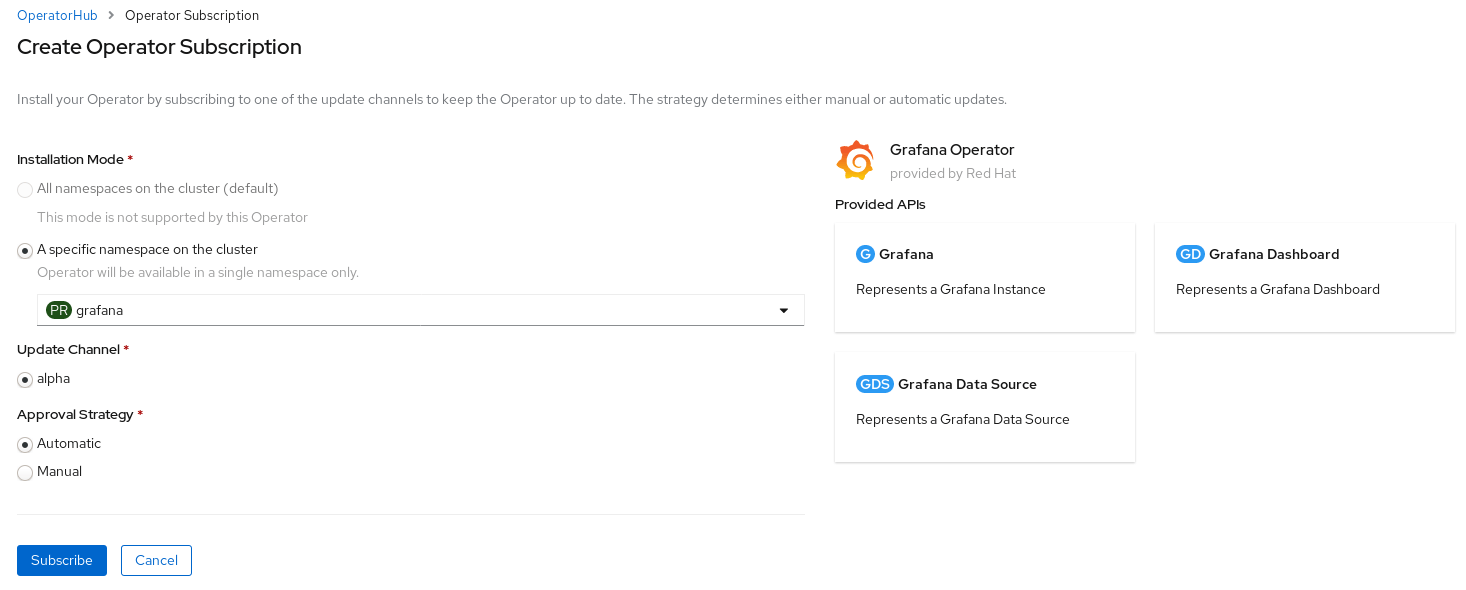 From Operator Subscription Page: – Choose A specific namespace on the cluster and select grafana – Select Automatic for Approval Strategy – Click Subscribe button