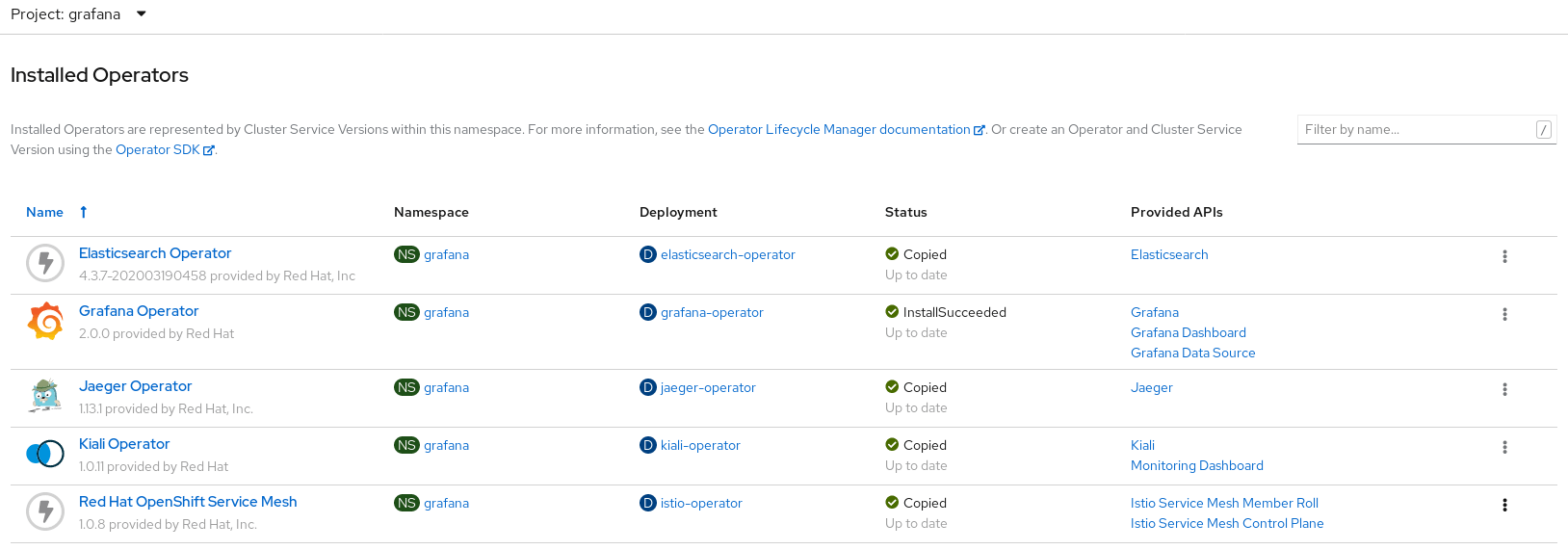 – Wait until its status turns to InstallSucceeded and grafana-operator-xxx-xxx pods is running :