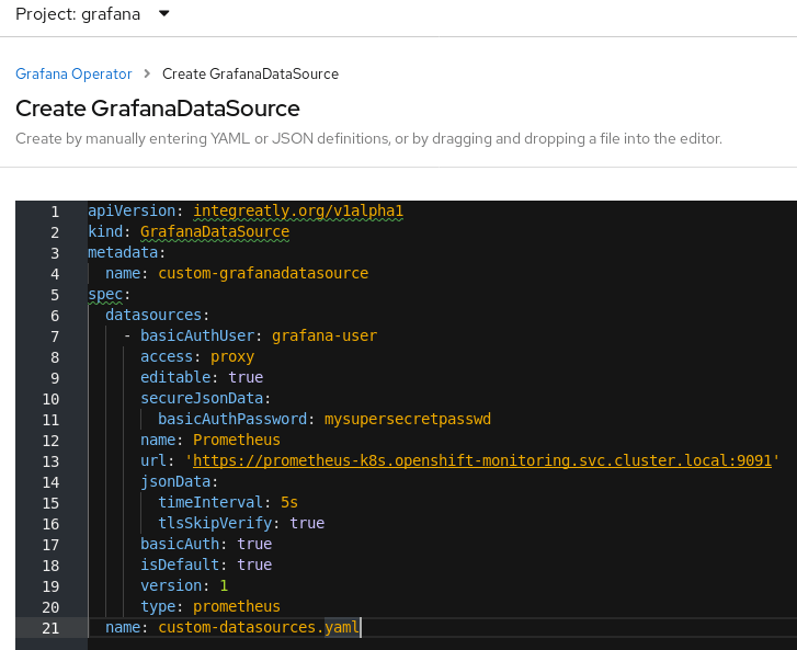 Before creating Grafana Instance and Grafana Data Source , Administrators need to create special user to the existing Prometheus secret: 1. Navigate to openshift-monitoring namespace: