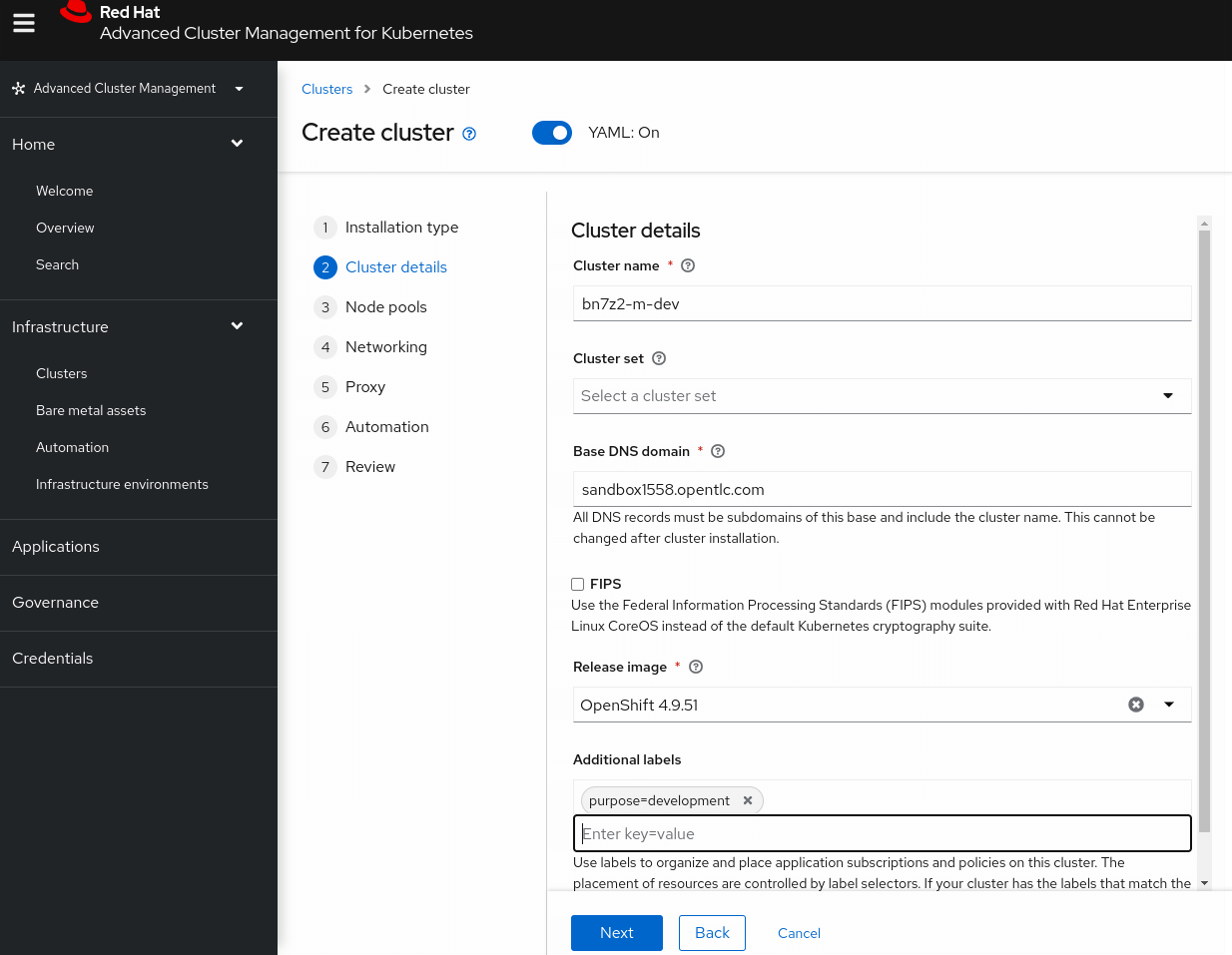 - For Node pools, specify the following parameters, and then click Next: Region: ap-southeast-2 Architecture: (do not set) Control plane pool → Zones: (do not set) Control plane pool → Instance type: m5.2xlarge Control plane pool → Root storage: 100 (do not change) Worker pool 1 → Pool name: (do not change) Worker pool 1 → Zones: (do not set) Worker pool 1 → Instance Type: m5.xlarge (do not change) Node Count: 0