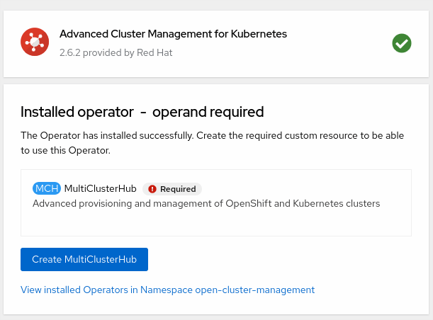 Click Advanced Cluster Management for Kubernetes , and then click Install .