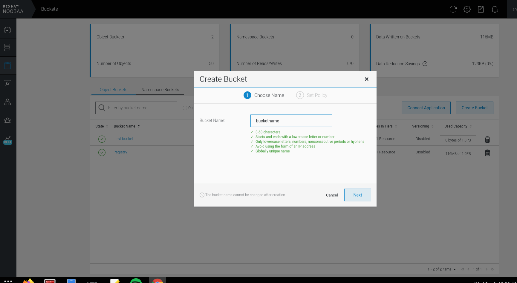 - Login to NooBaa console, Buckets > Create Bucket > Bucket Name: registry > Next > Policy Type: Spread (we need multiple different backing store to use mirror, we are using spread and relying on underlying Ceph cluster) > Tick default backing store > Create .