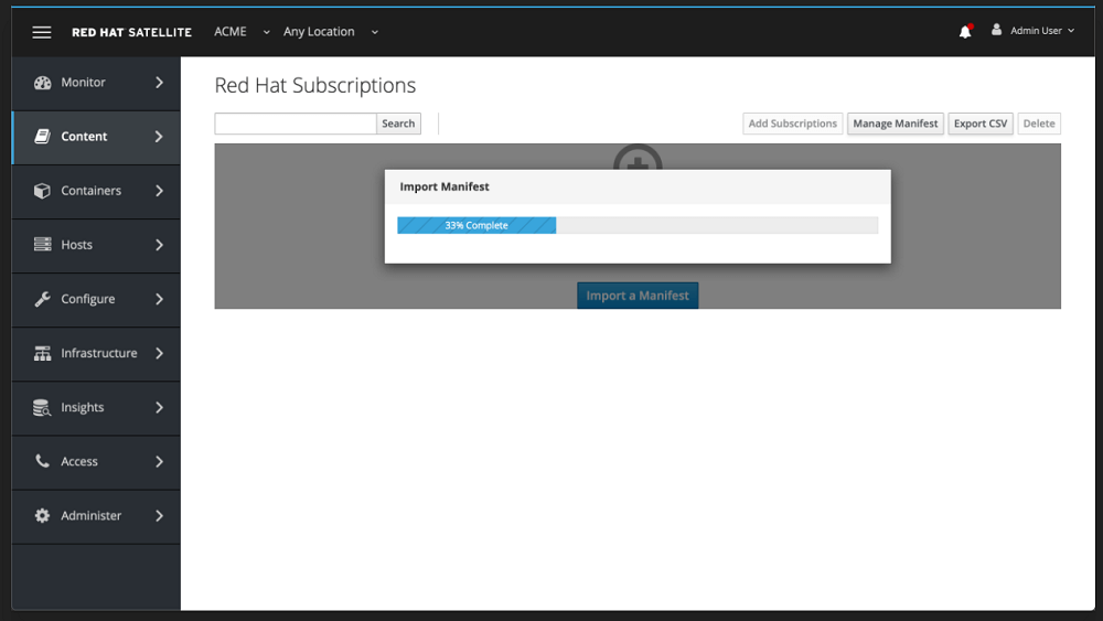 Open Satellite Server Web Console, Content -> Subscriptions -> Manage Manifest
