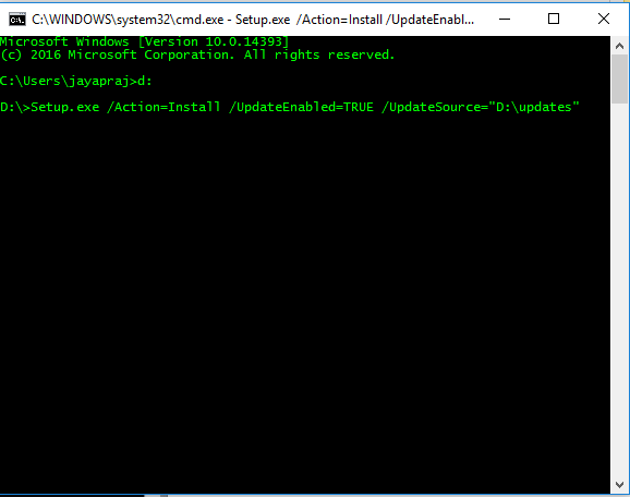 Setup.exe /Action=Install /UpdateEnabled=TRUE /UpdateSource=”D:\Updates”