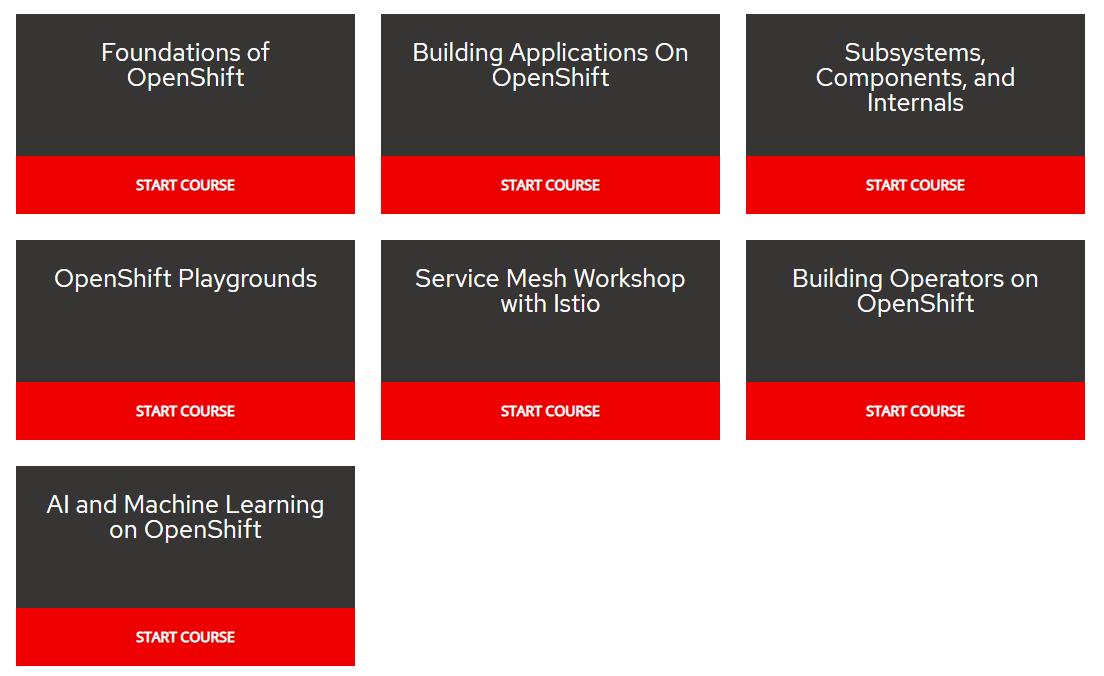 Visit openshift.katacoda.com now you can choose any section of the course. Click on Start Course and you will see several scenarios to learn.